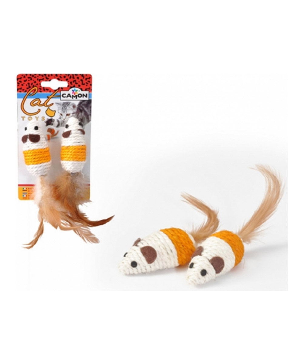 Per il divertimento del tuo felino, ecco i topini in sisal dotati di piuma. Due topini realizzati in sisal naturale (lo stesso materiale dei tiragraffi) per stimolare al gioco, richiamando il naturale istinto della cacci.