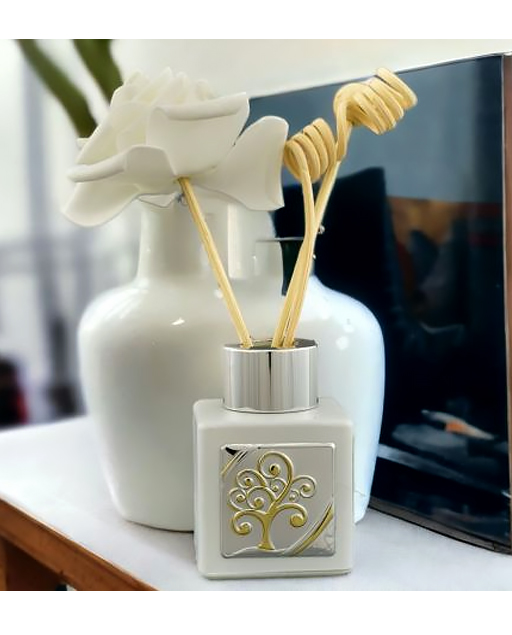 Diffusore Albero della vita argento, una perfetta scelta come bomboniera per ogni evento. Disponibile in varie dimensioni a seconda della versione scelta (Piccolo: 4,2X4,2X7(50 ml); Standard : 6X6X8,5cm(100 ml); Grande: 7X7X10cm(200 ml), Maxi: 9,5X9,5X15cm(500 ml), ospita una placchetta a forma di cuore decorata con simboli portafotuna albero della vita con dettagli in color oro. Bacchette e scatola regalo sono inclusi nel prezzo.