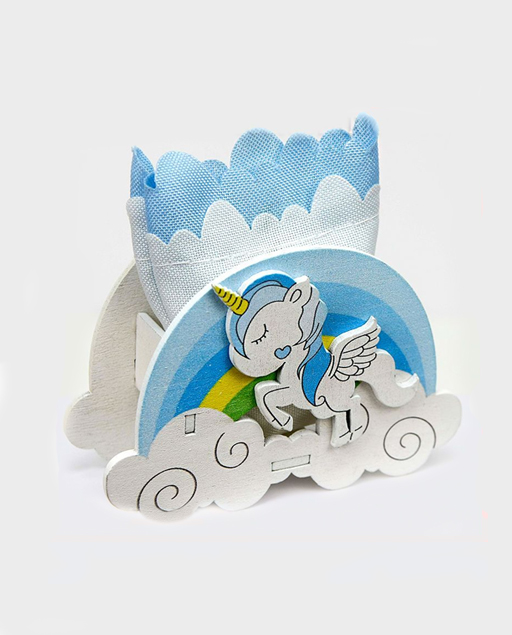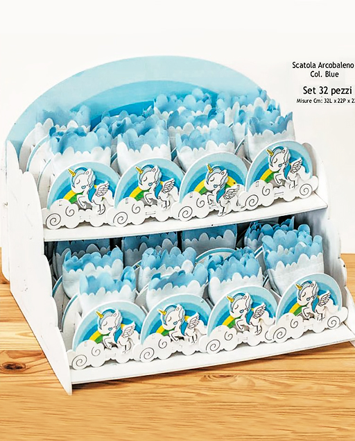 – 32 scatoline portaconfetti in legno con immagine arcobaleno e unicorno colorati con tonalità di azzurro e specifiche per bomboniere unicorno nascita e battesimo maschio, complete di sacchettini in cotone in cui inserire i confetti;