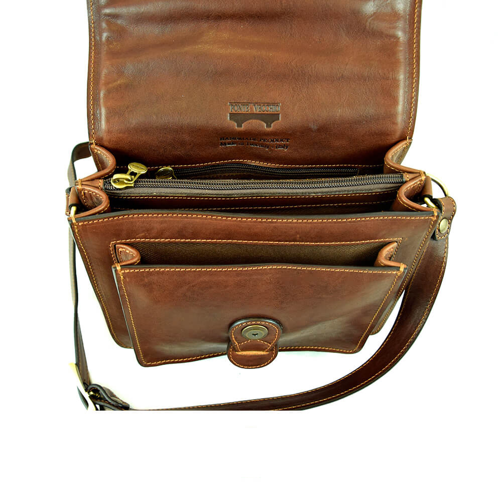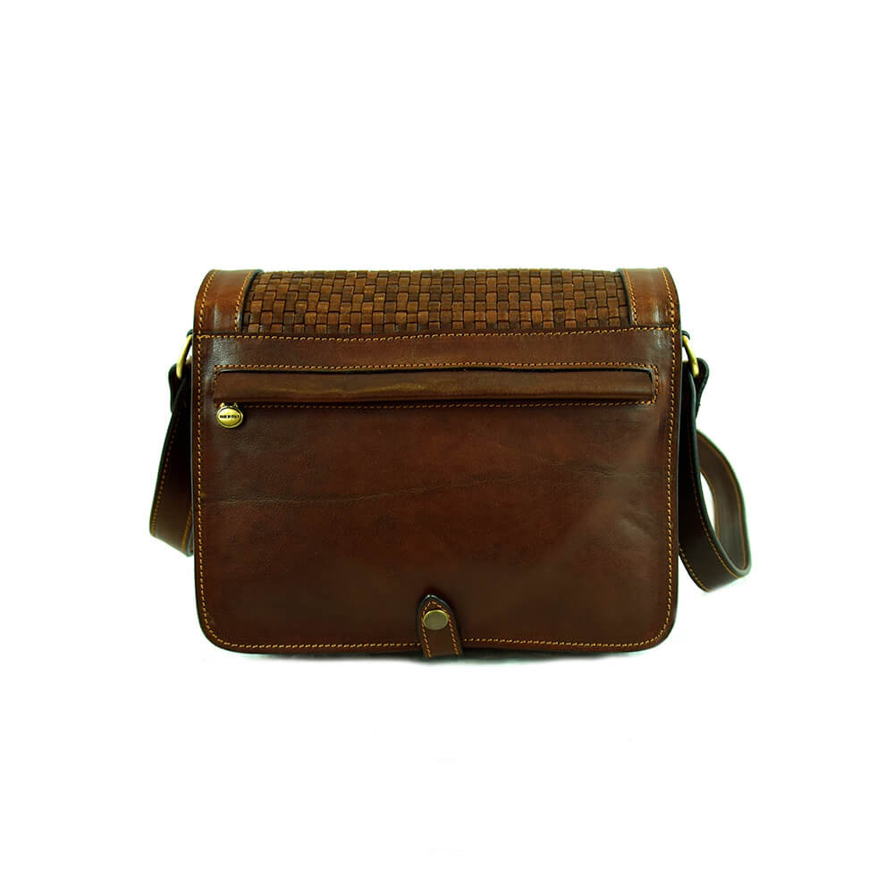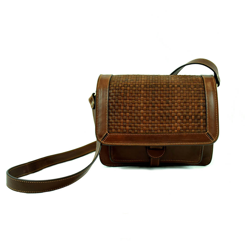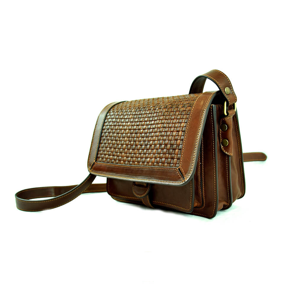 Borsa a spalla da donna con patta realizzata in pelle intrecciata a mano.