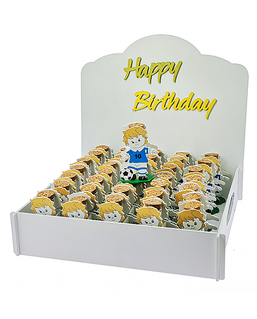 Bomboniera calciatore con fialetta. Calciatore realizzato in legno. Regaliamo anche scatolina porta bomboniere con incisione sulla scatolina “Happy birthday”.
