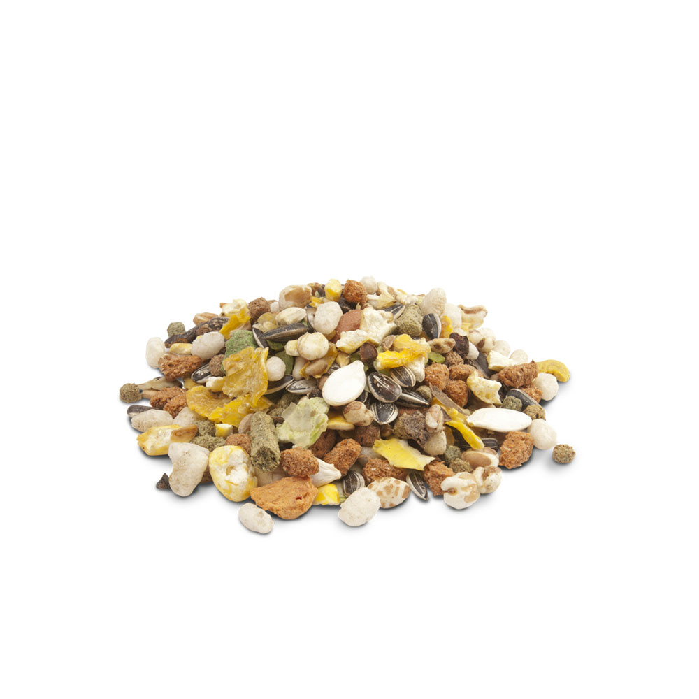 cereali (40%), sottoprodotti di origine vegetale, ortaggi, semi, noci, frutta, estratti di proteine vegetali, sostanze minerali, oli e grassi, zuccheri