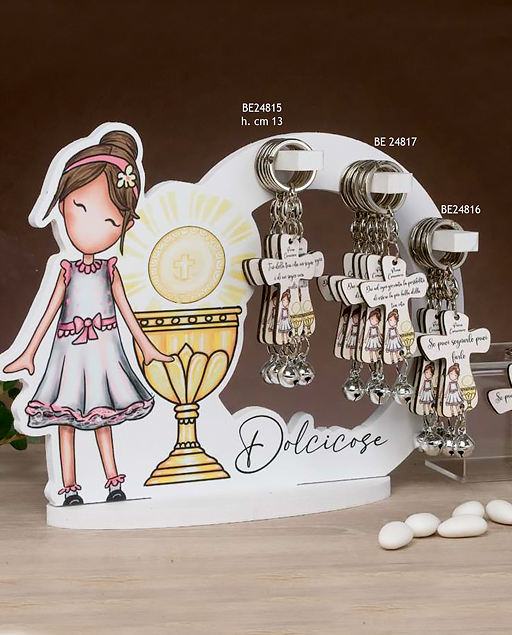 Portachiavi bimba Prima Comunione realizzato in legno. Bomboniera Prima Comunione Bambina – un’elegante croce porta chiavi – trasporta le emozioni di questo giorno speciale attraverso le parole incise con amore. Ogni pezzo è un pezzo unico, decorato con varie frasi significative che tu possa scegliere, e un campanellino che suona come un dolce richiamo agli angeli. Questo non è solo un regalo per gli ospiti, ma un simbolo di gratitudine per condividere questa giornata con te.