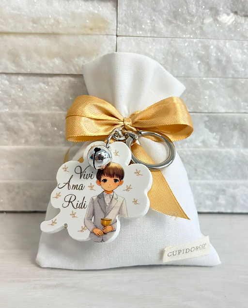 Sacchetto con portachiavi quadrifoglio bimbo Prima Comunione. Sacchetto realizzato in cotone bianco con cura e usando materiali di alta qualità, che aggiunge un tocco di classe al suo design.
