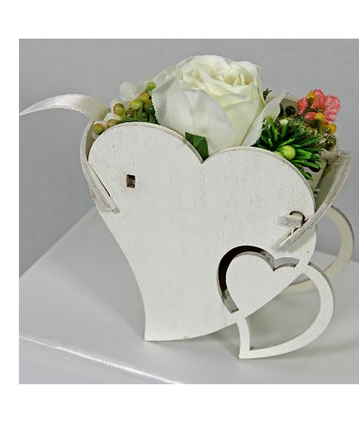 Graziose scatoline a forma di cuore, realizzate in legno, cuore con un decoro superiore composto da diverse tipologie di fiori artificiali removibili che, una volta sollevato, permette l’inserimento dei confetti. Ideali anche come segnaposto.