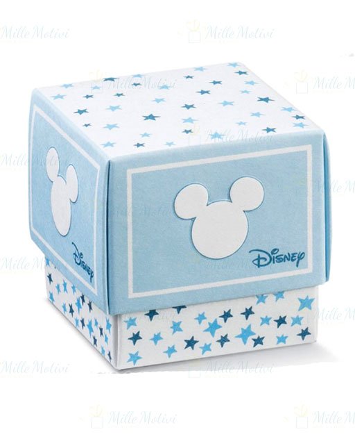 Scatola portaconfetti Topolino Disney forma quadrata realizzata da un fondo bianco ed un coperchio colorato e stelline.