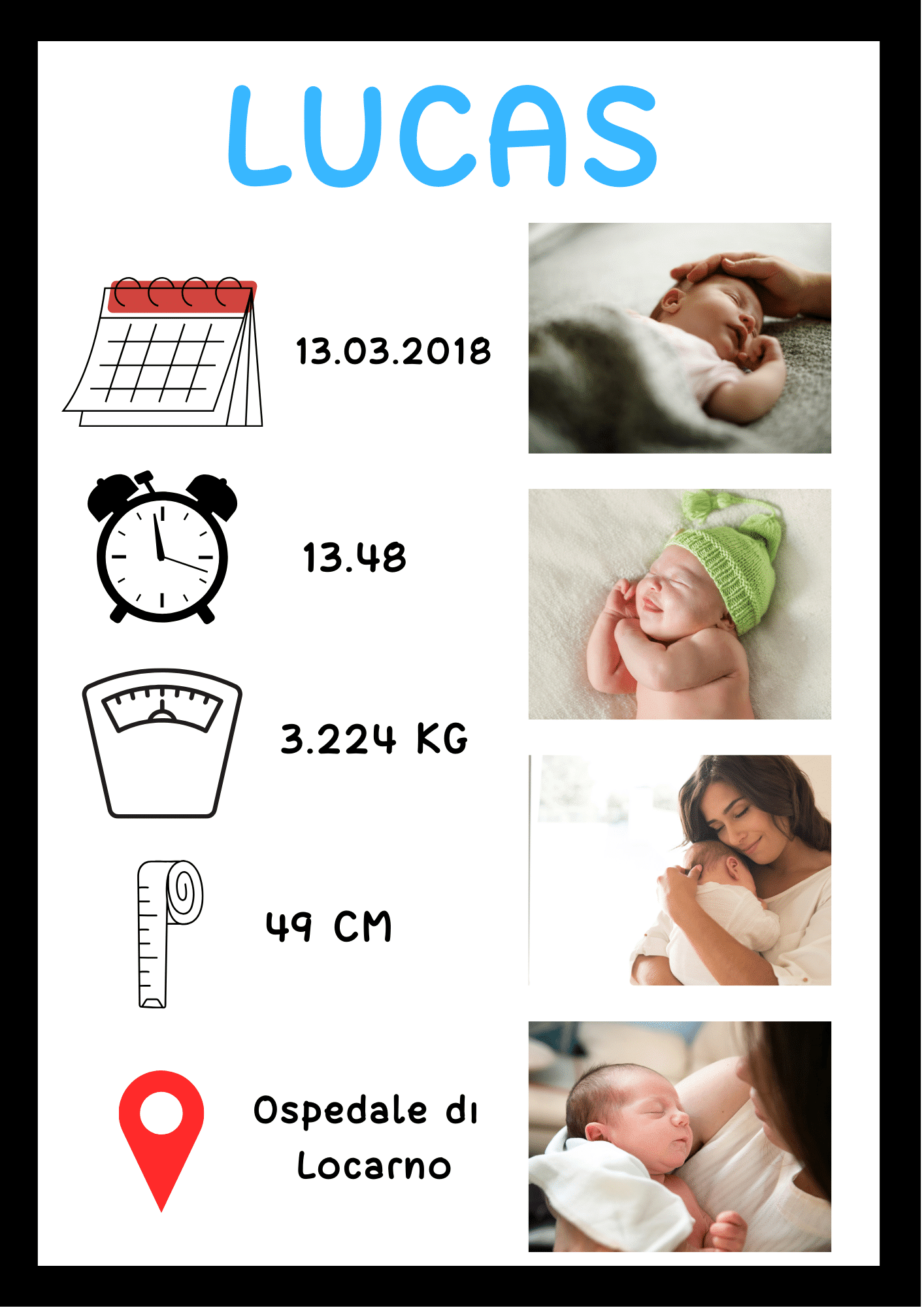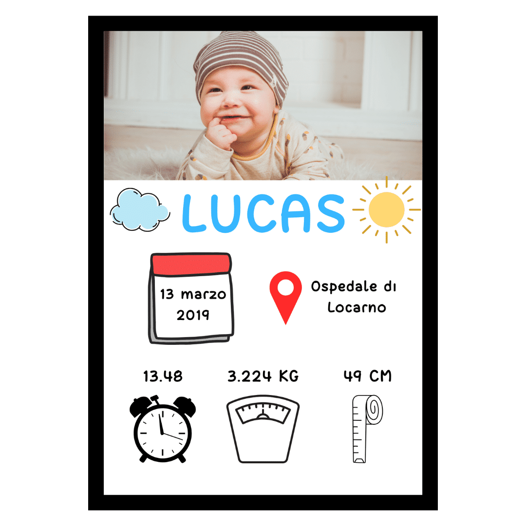 Il poster personalizzato “Neonato” non è solo un’opera d’arte, ma un ricordo significativo dei primi giorni di vita del tuo bambino. È l’idea regalo perfetta per i neo-genitori o per decorare la cameretta del neonato con un tocco personale ed emozionale. Un’opzione ideale per chi desidera immortalare i primi momenti speciali, rendendoli visibili ogni giorno. Grazie alla possibilità di personalizzare ogni aspetto del design, questo poster si adatta perfettamente a qualsiasi stile di arredamento e preferenza.