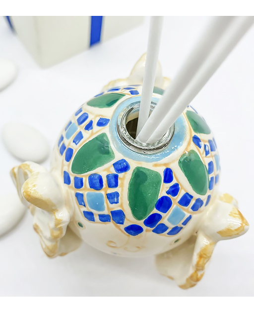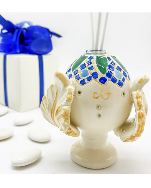 Profumatore pumo pugliese realizzate in porcellana finissima decorata con una fantasia blu e verde su base crema.