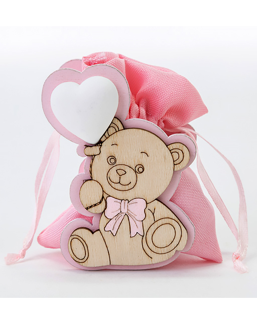 Sacchettino orsetto rosa realizzato in legno. Ideale per nascita, battesimo.