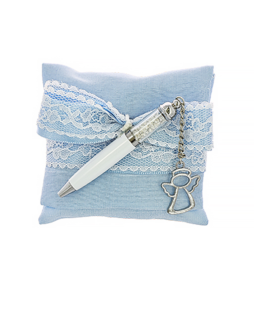 Sacchetto busta con penna cielo cristalli. Sacchettino realizzato con fantasia ombra shantung celeste. La penna presenta un ciondolo con angioletto. Nuova collezione. L’idea è quella di donare agli invitati qualcosae di speciale. Se sei alla ricerca di bomboniere made in Italy questo è il posto giusto!