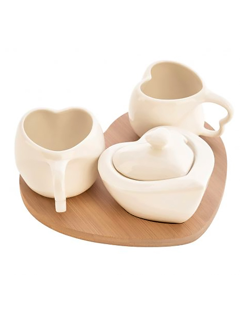 Bomboniera set con due tazzine da caffè con manico a forma di cuore e zuccheriera bianca con cucchiaino in porcellana, fornite con un adorabile vassoio in legno a forma di cuore.Dimensioni: 25 x 25 cm