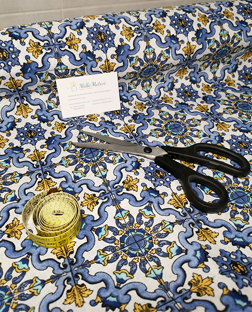 Stoffa fantasia maiolica blu realizzata in tessuto : cotone arredamento. Nuova collezione Sicily 2021. Realizzata in : cotone 70% pol. 30%