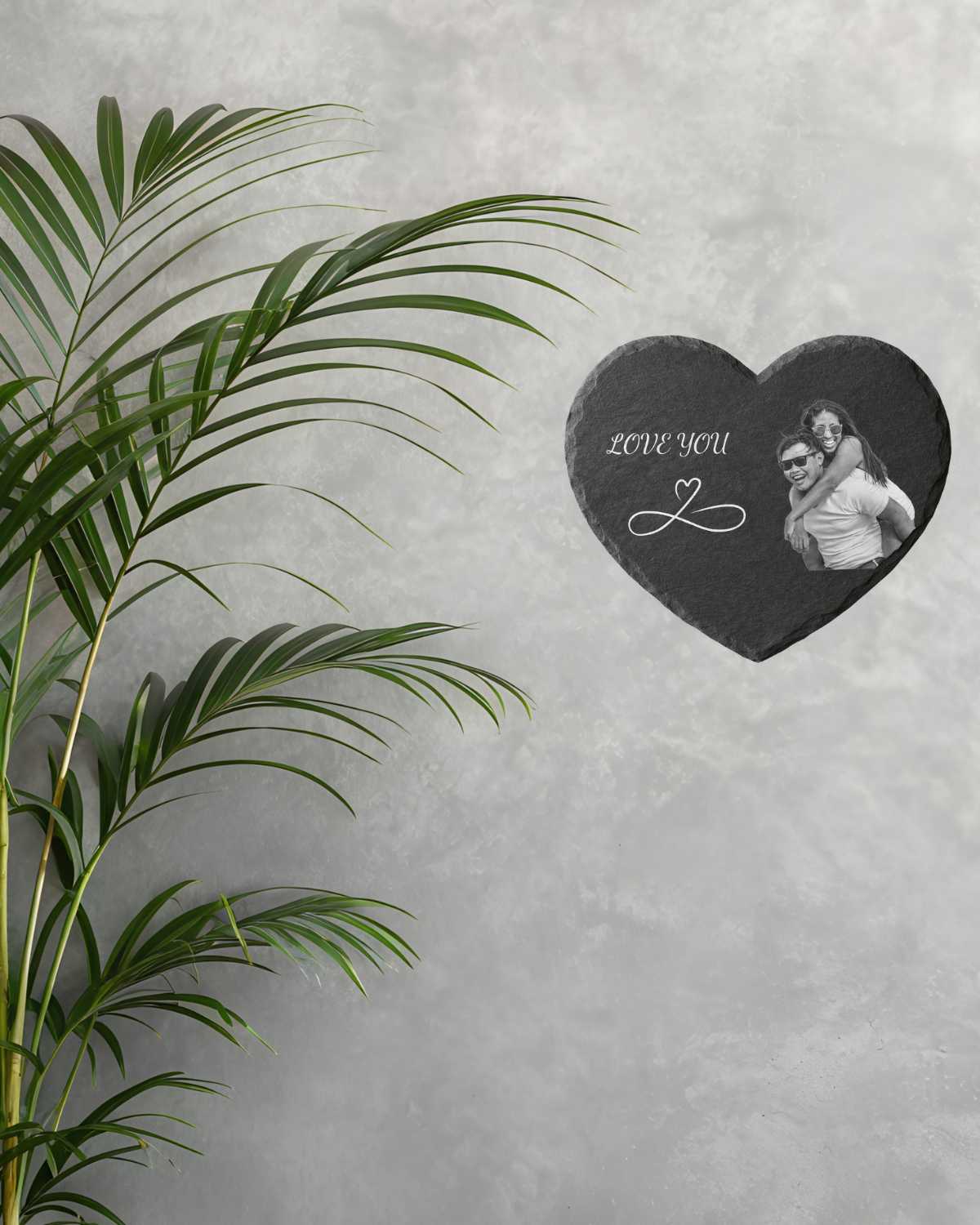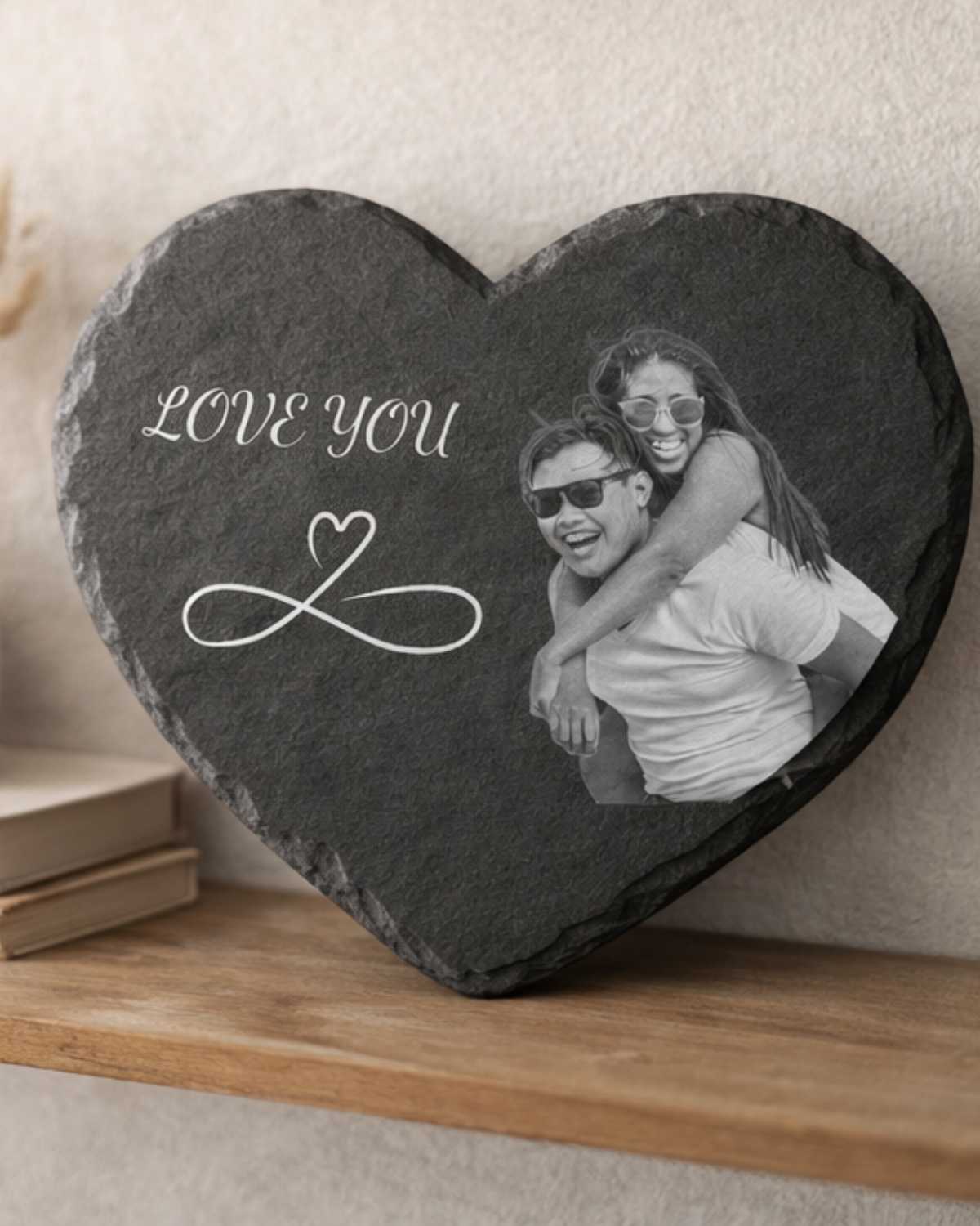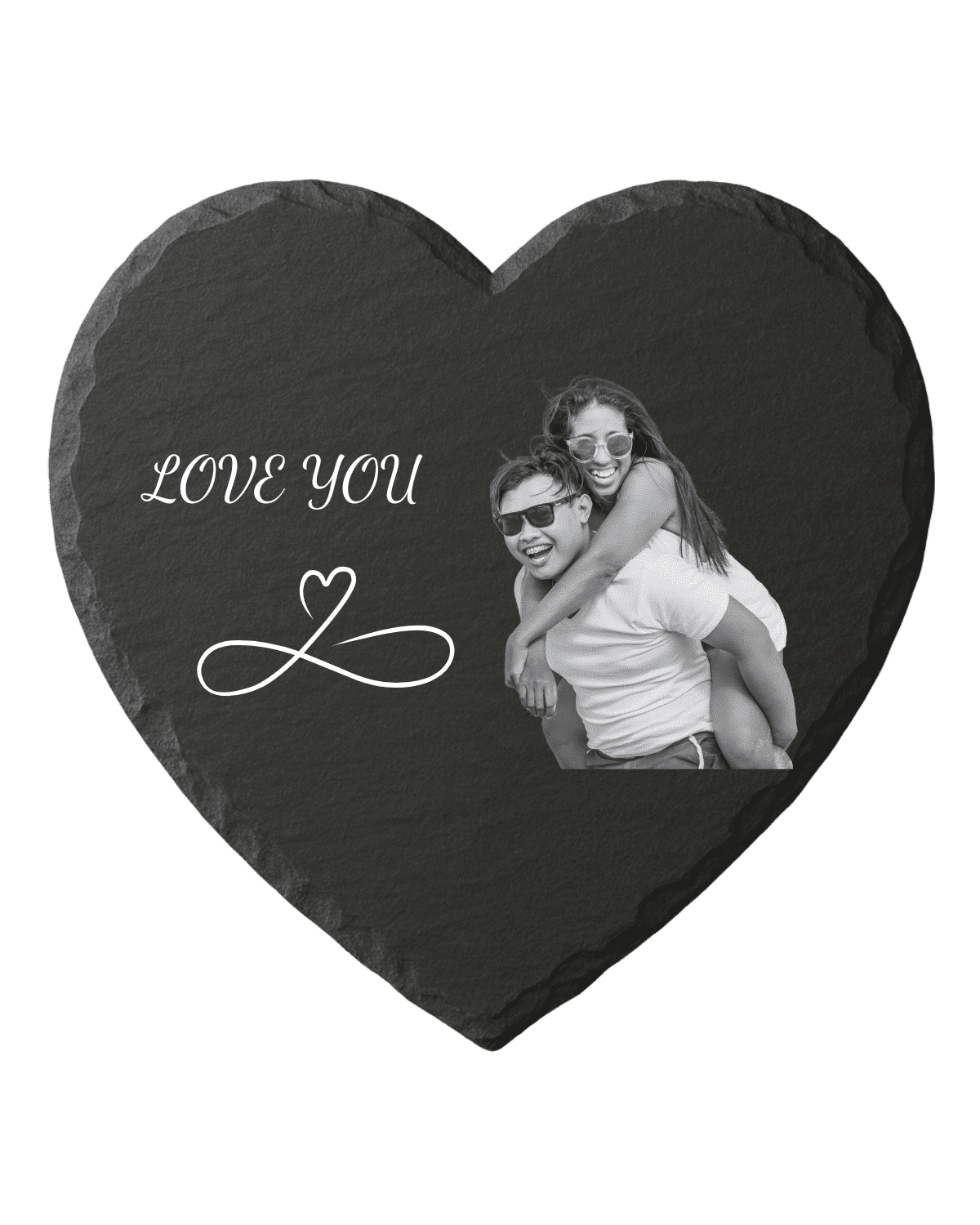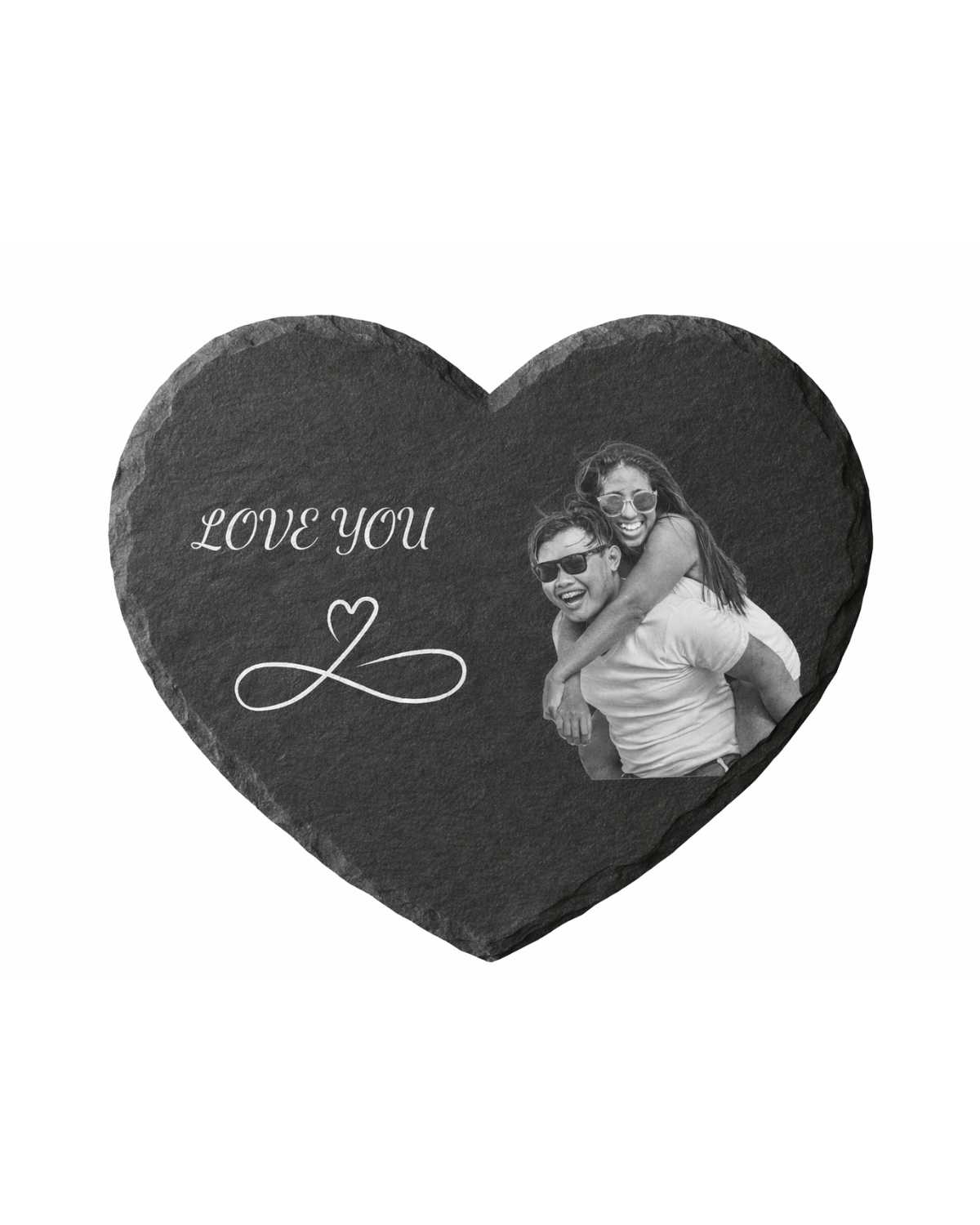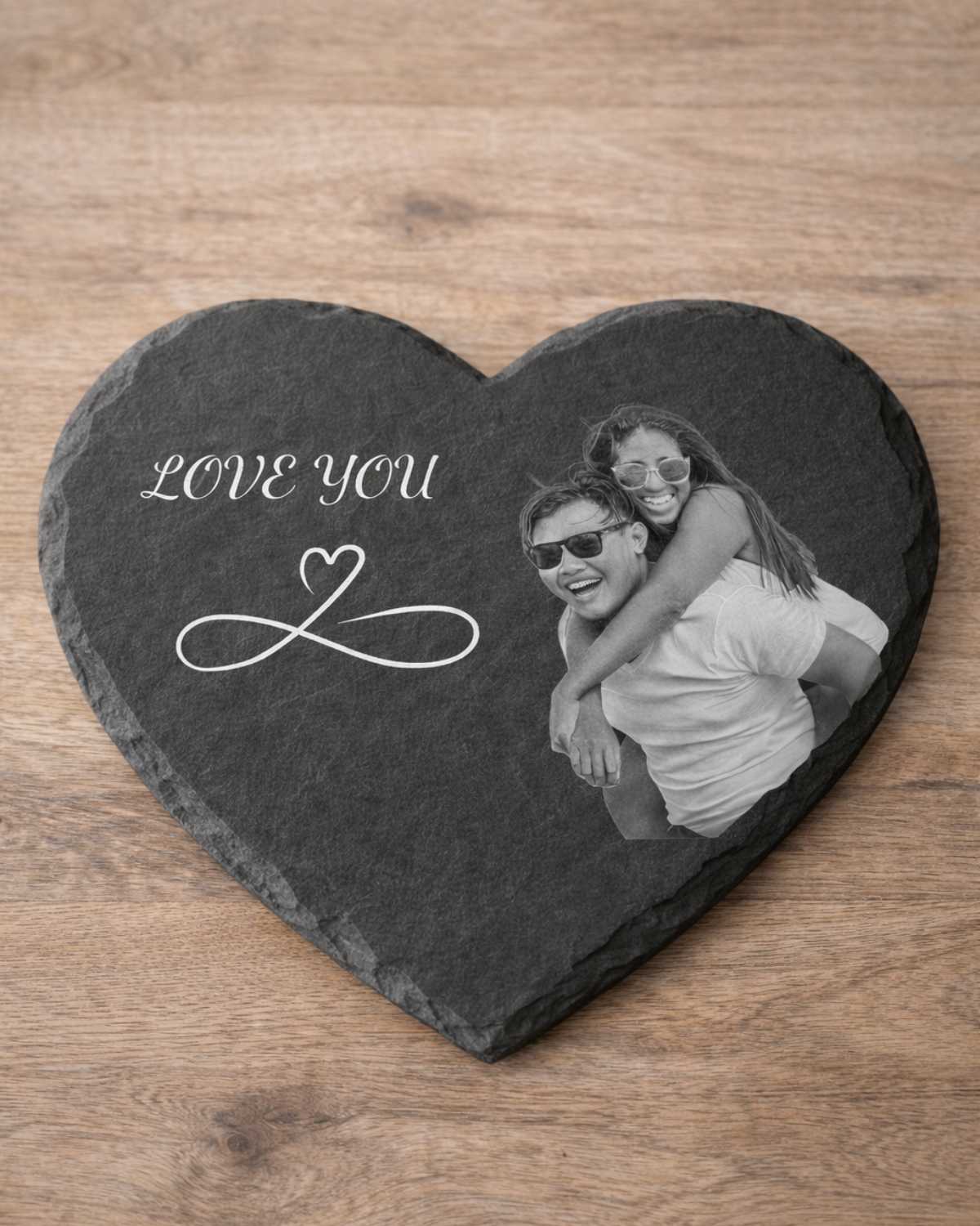 Un cuore inciso con amore: personalizza il tuo tagliere in ardesia con foto, testi o grafiche.